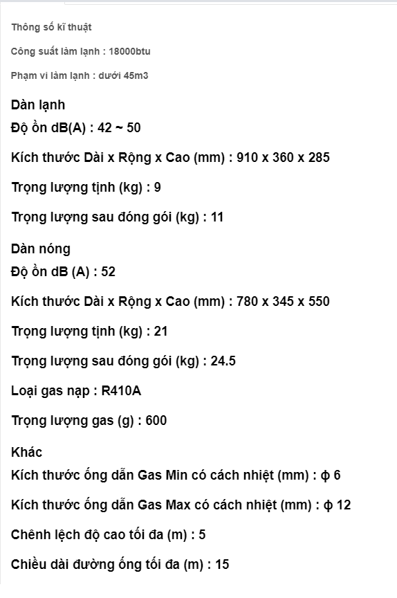 - Bảo hành : 02 năm dàn lạnh, 05 năm máy nén