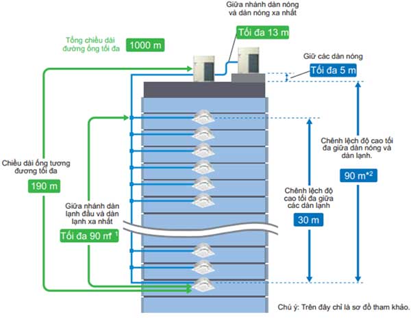 Một dàn nóng có thể kết nối với tối đa 64 dàn lạnh, chiều dài đường ống dài và chênh lệch độ cao lớn tạo sự linh hoạt tuyệt đối trong cách bố trí.