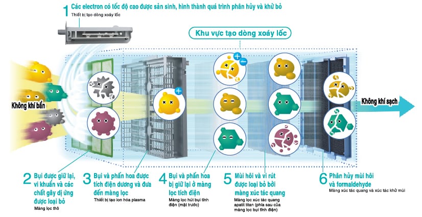 Công nghệ ion plasma sử dụng phóng điện plasma để giải phóng ion vào trong không khí, kết hợp với các thành phần của không khí tạo thành các chất hoạt động với sức mạnh oxy hóa mạnh như gốc OH. Chúng sẽ bám vào bề mặt của nấm và các chất gây dị ứng và phân hủy các protein trong không khí bằng ôxy hóa