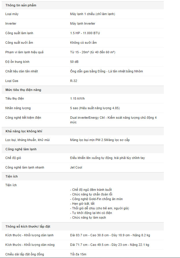 - Bảo hành : 2 năm dàn lạnh, 10 năm máy nén